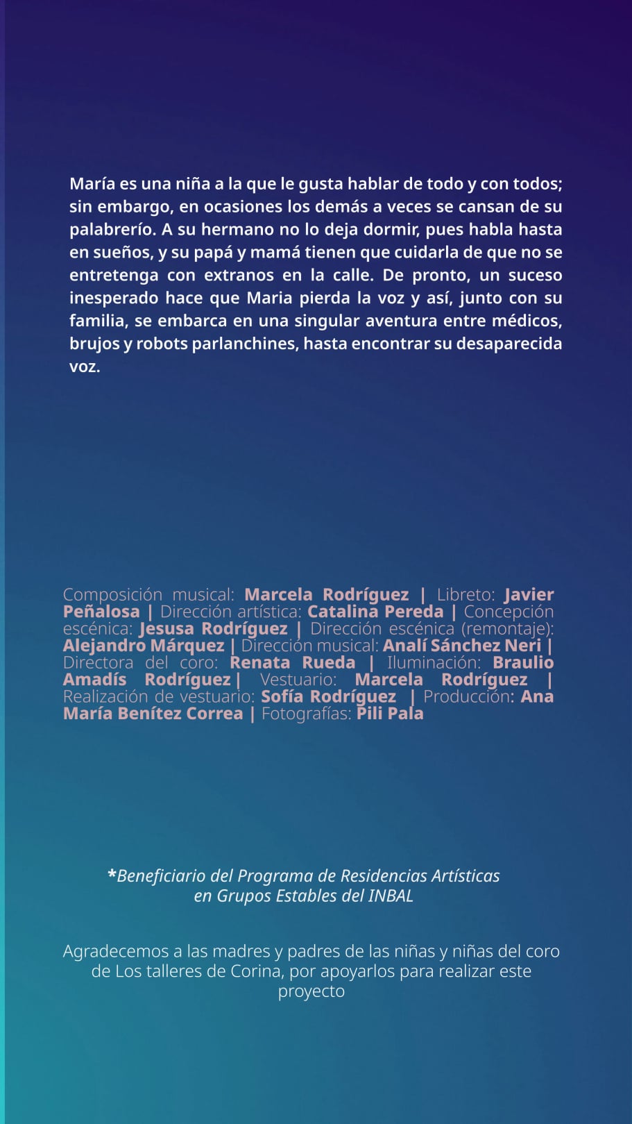 “De óperas y otras criaturas” es una residencia de nuestra compañía Ópera Portátil en el Teatro El Galeón del Centro Cultural del Bosque y consiste en la reposición de nuestras cuatro óperas infantiles y el estreno de dos obras interdisciplinarias, así como una exposición retrospectiva en el vestíbulo del teatro, un conversatorio alrededor de la ópera contemporánea, un taller de incubación de óperas y la presentación de nuestro primer volumen discográfico en colaboración con la disquera Úrtext Digital Classics.